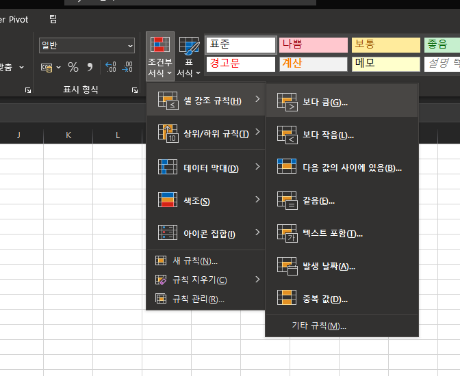 조건부서식 임의 값보다 크거나 작은 셀 표시
