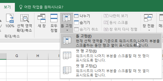 - 보기 > 틀 고정 > 틀 고정을 선택합니다.