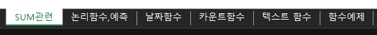 | SUM | = sum(1, 2, 3...숫자) | 지정된 셀 범위의 합계를 구하는 함수 (인수는 최대 30개까지 사용) |