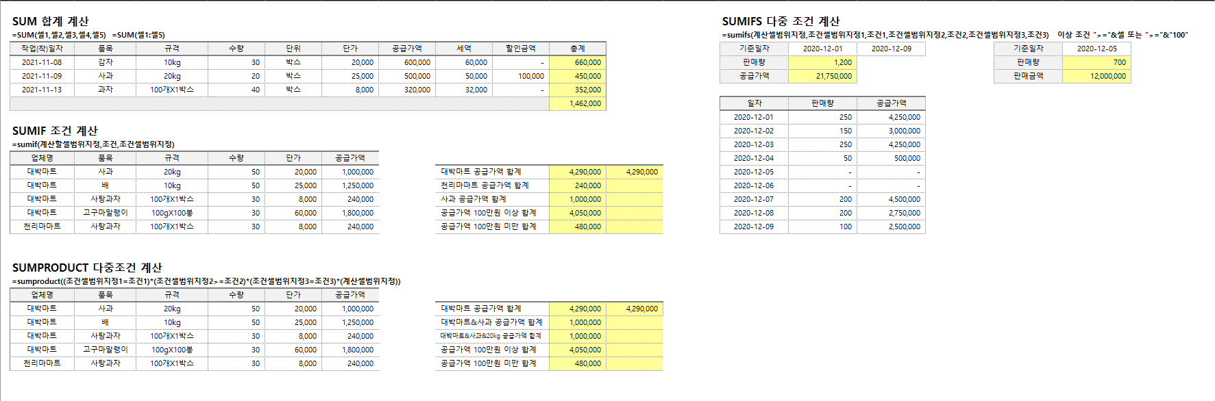●SUM 관련 - SUM(합계), SUMIF(조건계산) , SUMIFS(다중 조건 계산), SUMPRODUCT (다중조건계산)